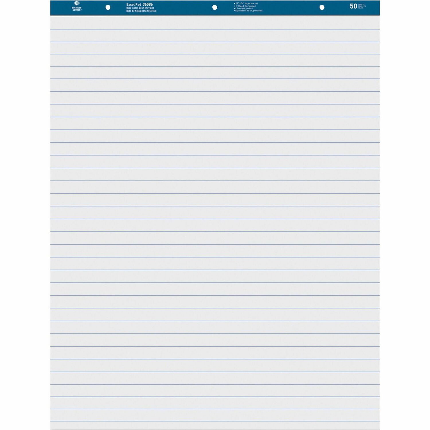 Standard easel pad contains 50 sheets of ruled, perforated, white 15 lb. paper. Pad binding has punched three holes, 8-3/4" c-c.