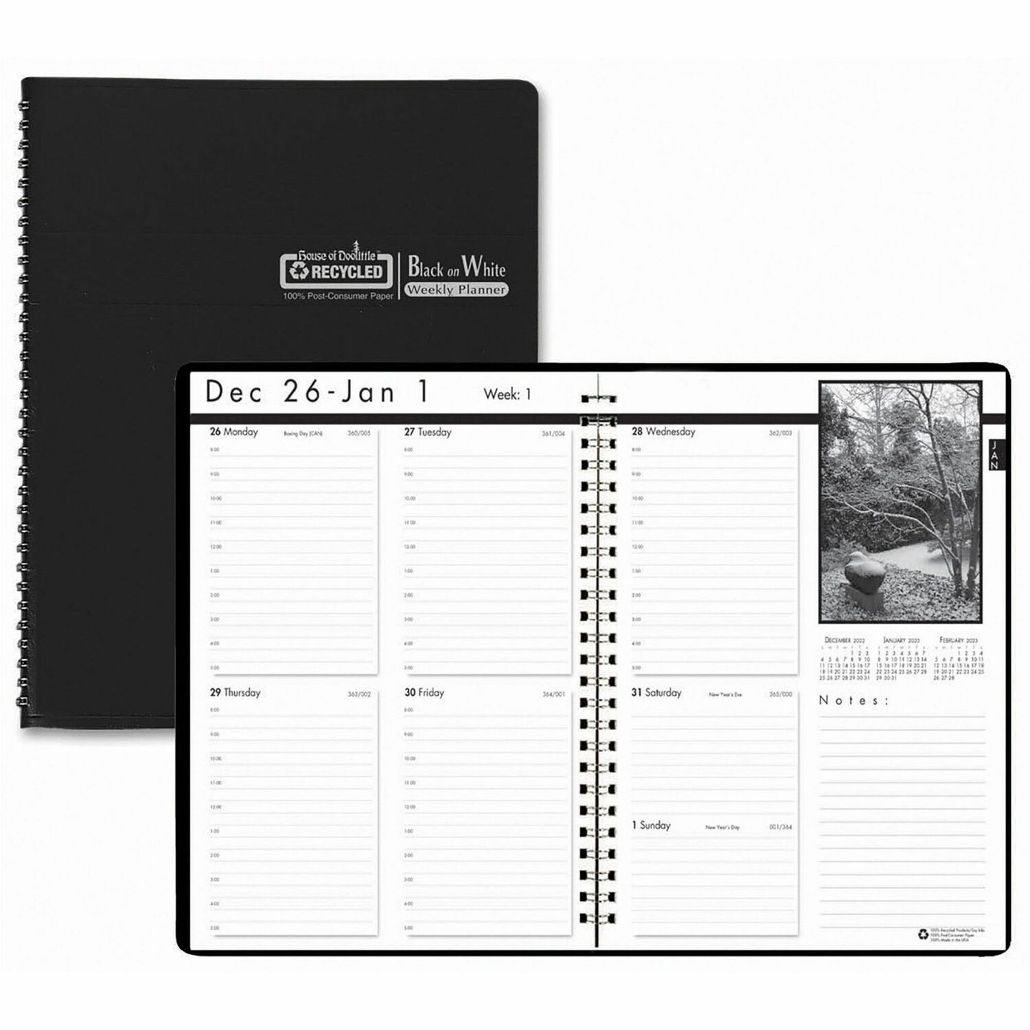Appreciate the light and shadows and enjoy the wonders of nature while scheduling appointments or jotting down notes when you use this weekly planner. Dated planning pages range 12 months from January to December and a different, distinctive, black/white photo on each spread. Hourly appointment increments from 8 AM to 5 PM within each day allow you to keep track of meetings, daily projects and weeklong goals. Two-page-per-week spreads include ruled daily entries, numbered weeks, Monday-through-Sunday scheduling, ruled notes section, count of days/days remaining, and past, current and future months reference. Printed monthly indicators let you quickly find the date you need. Nonrefillable planner also features a double-sided storage pocket, suede-like cover and wire binding. FSC certified paper is made with a high percentage of recycled material.