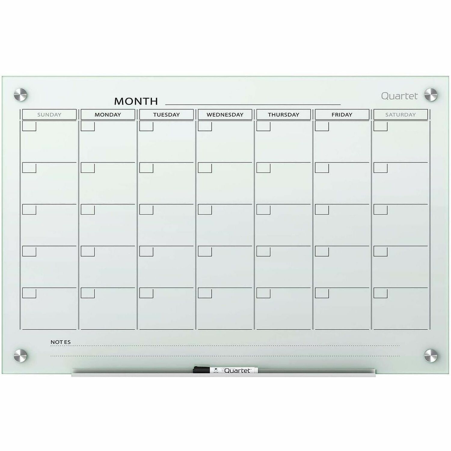 Glass calendar board provides long-term durability for your monthly planning with a modern aesthetic appeal. Frameless board design blends seamlessly into any environment. Reuse month after month to keep track of your schedule all year long. Monthly format offers daily blocks and a ruled column for notes. Tempered glass surface will not stain, ghost, scratch or dent despite heavy use. The magnetic feature allows instant hanging of documents and notes. Dry-erase marker glides evenly over the board surface for smooth writing. Nonabsorbent glass is easy to keep clean with Quartet whiteboard cleaning supplies. Board includes one Quartet dry-erase marker and two rare-earth, high-power magnets.