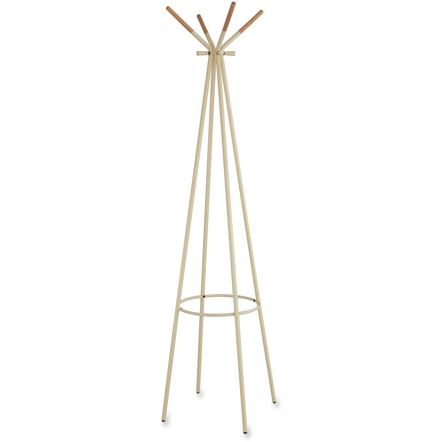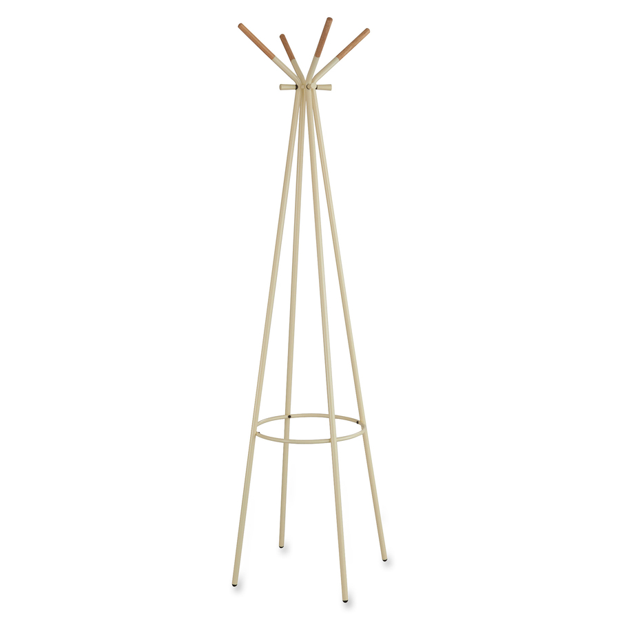 Coat rack offers a modern design to manage your coats and jackets. Hang them on the four steel garment hooks with wood tips. Additional four hooks below wood tip hooks offer a place to hang accessories. Rounded edges on all hooks help protect garments. Frame is made of steel for durability and stability. The ring near bottom provides storage for umbrellas.